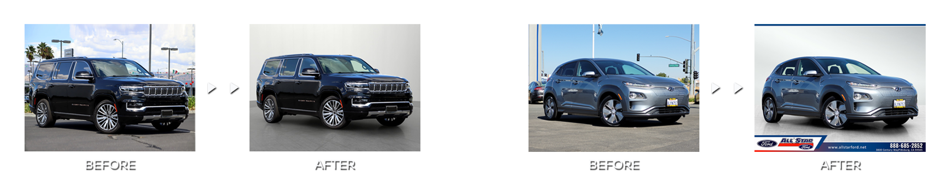 Vehicles can be photographed anywhere on the lot using standard phone cameras, then processed with digital backgrounding to create clean, studio-style presentation.